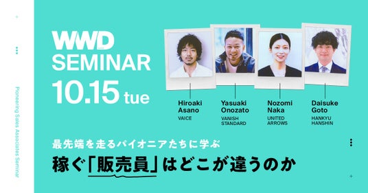 本セミナーでは、販売職のDX化を推進するバニッシュ・スタンダードの小野里寧晃社長と、同社が主催する“令和のカリスマ店員“を決める大会「スタッフオブザイヤー2023」の優勝者であるユナイテッドアローズの仲希望さんとの対談を通じて、販売員のポテンシャルを考えます。LTV(ライフタイムバリュー)という概念によって改めて脚光を浴びる百貨店の外商の仕事術について、阪急阪神百貨店のエース外商員である後藤大祐さんがさまざまな事例を交えてロイヤリティーを深める仕事術について話します。さらに、人気ヘアサロン「VAICE」の浅野宏明さんには、顧客との距離が近い美容師という立場からロイヤルカスタマーの心をつかむ秘訣を明かしてもらいます。