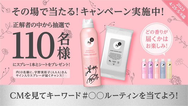 エージーデオ24公式Twitterにて、クイズに答えてその場で当たる「エージーデオ24 わたしの#〇〇ルーティンを当てよう!キャンペーン」を実施いたします。エージーデオ24公式Twitter(@agdeo24)をフォローの上、宇野実彩子さん出演のWeb CMを視聴後、対象投稿内の「#〇〇ルーティン」からWeb CMに出てくるキーワードを選んでご投稿いただくと応募完了です。正解者の中から抽選で110名様に、エージーデオ24セットとして、「エージーデオ24 パウダースプレー 142g」(全5種のうち、いずれかの香り)および「エージー24 クリアシャワーシートn」(10枚入・無香性)をプレゼントいたします。そのうち10名様には、宇野実彩子さんサイン入り「エージーデオ24 パウダースプレー 142g (フローラルブーケの香り)」が当たるチャンスもご用意しています。奮ってご参加ください。