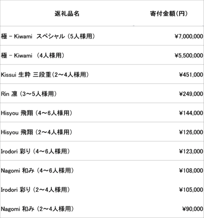 新潟県三条市(市長:滝沢 亮)のふるさと納税に、有限会社 角屋(本社:新潟県三条市、代表取締役社長:大野 信一氏)の寄付金700万円への新規返礼品として、おせち「「極 – Kiwami スペシャル(5人様用)」を本日、楽天ふるさと納税、ふるさとチョイス、ふるなび、さとふるにて出品いたしました。その他に、おせち「極 – Kiwami(4人様用)」など9品目の生詰めおせちも出品しています。
