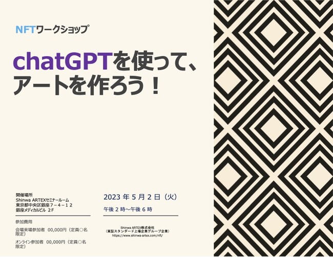 Shinwa Wise Holdings 株式会社(所在地:東京都中央区銀座、 代表取締役 倉田 陽一郎)の100%子会社であるShinwa ARTEX 株式会社(以下、Shinwa ARTEX 所在地:東京都中央区銀座、 代表取締役 岡崎 奈美子)は、NFT クリエーションのワークショップを開催します! 前回好評だった NFT ワークショップの第2弾! 今回の目玉は、話題沸騰の ChatGPT!
