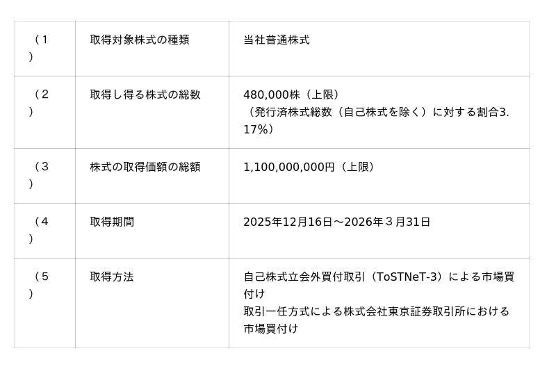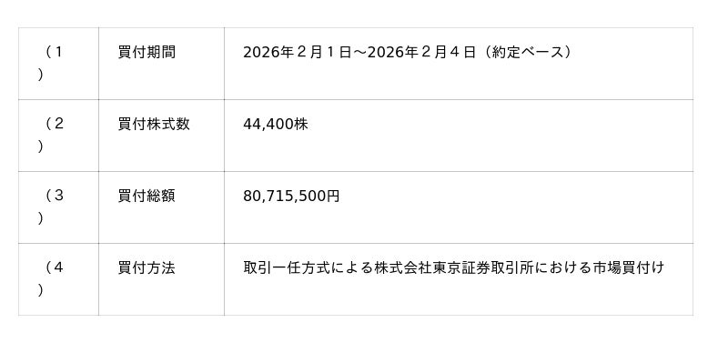 当社は、2025年12月15日開催の取締役会において決議いたしました、会社法第165条第3項の規定により読み替えて適用される同法第156条の規定に基づく自己株式の取得状況につきまして、下記のとおりお知らせいたします。