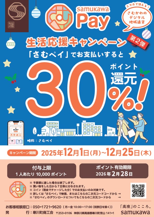 さむかわPayは、寒川町内の加盟店で使用できる地域活性化を目的としたキャッシュレス決済アプリです。町内の人だけでなく、町外の人でも寒川町の加盟店で、さむかわPayを使って買い物や食事等をすると30%分のポイント(1人あたり最大で10,000ポイント)が還元されます。