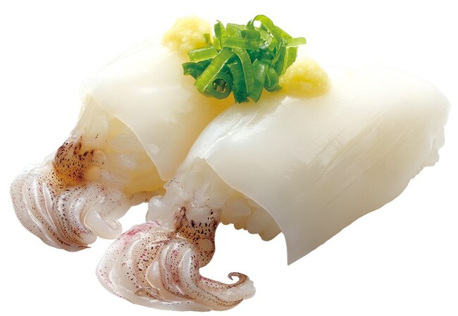 ※焼津産一本釣り大切りびんちょう、北海道産アカイカのうに和えつつみ、姿やりいか、地中海産本鮪ほほ肉握りは関東・東北・北海道の店舗で販売しております。