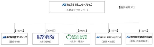 創業57年、物造りにこだわった信頼と実績の東証上場デベロッパーとして、東京23区を中心に200棟を超える“新築1棟投資用賃貸住宅”を供給している株式会社明豊エンタープライズ(東京都目黒区:代表取締役 矢吹 満)を親会社とし、賃貸管理会社の株式会社明豊プロパティーズ(東京都目黒区:代表取締役 竹内 智大)、株式会社ハウスセゾンエンタープライズ(京都府京都市:代表取締役 奥山 秀昭)、建設会社の株式会社明豊エンジニアリング(東京都目黒区:代表取締役 阪本 伸司)、株式会社協栄組(東京都世田谷区:取締役 徳満 亮輔)、海外現地法人の東京明豐開發股份有限公司(本社 台北市中山区:代表取締役 内田 千博)で構成されております。