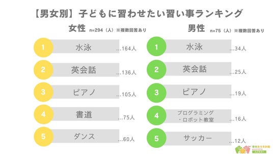 続いて、「子どもに習わせたい習い事」について男女別に分析したところ、1位~3位までは「水泳」「英会話」「ピアノ」と同様の順位でした。ただ、4位以降は全く異なっており、女性が4位が「書道」で5位は「ダンス」なのに対し、男性は4位が「プログラミング・ロボット教室」、5位が「サッカー」という結果になりました。子どもに習わせたい習い事には、多少の男女差があることがわかります。