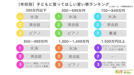 最後に、年収別に「子どもに習わせたい習い事」について分析したところ、ほとんどの年収世帯で水泳と英会話が1位と2位にランク入りしていることがわかりました。ただ、3位にはそれぞれ違いが現れています。また、1,500万円以上の世帯では水泳や英会話よりも「ピアノ」や「プログラミング・ロボット教室」が人気を集めており、違いがあることがわかりました。