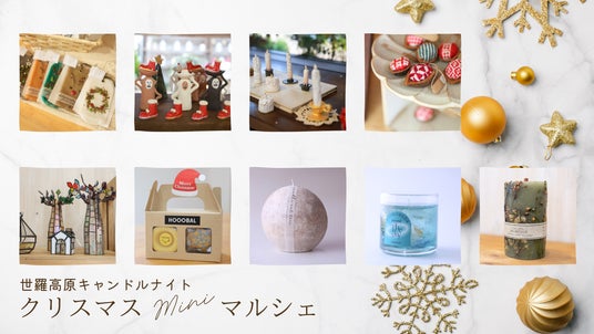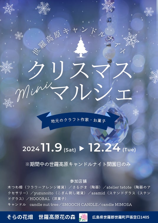 「世羅高原キャンドルナイト」会場では、広島県内のクラフト作家を中心とした作品を集めた「クリスマスminiマルシェ」を開催中です。クリスマスに向けて、ここでしか手に入らないプレゼントをお買い求めください。あわせて、県内を中心として活動中のキャンドル作家のキャンドルも販売しています。