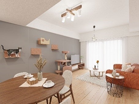『愛猫と過ごす』をテーマにリフォームした「藤和シティホームズ草加松原」は、リビングの一部の壁にLIXILの猫壁(にゃんぺき)を採用。壁パネルとパーツを組み合わせることで、自由にアレンジができるキャットウォークになります。フローリングは滑りにくい表面仕上げになっています。また、傷や汚れもつきにくい機能も備えています。ペットとの暮らしを考慮し、生活臭を抑制する機能、破れにくいハードストレッチ、水滴をはじき壁紙表面からの汚れ浸透を軽減する撥水性のあるクロスを採用しました。