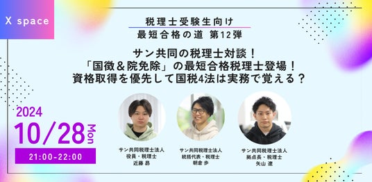 サン共同税理士法人(本社:東京都港区、代表社員: 朝倉 歩)は、 2024年10月28日(月)21:00より「税理士試験 最短合格の道」と題し、最短で試験に合格する勉強方法やモチベーション維持方法などをX(旧Twitter)スペースにてお伝えいたします。