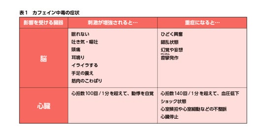 また、注目すべき事項として、カフェインを含んだ市販薬についても触れ、1錠当たり100mgのカフェインを含んでいるわが国で一番人気のある眠気・だるさ防止薬は容易に入手できるにも関わらず、10~30錠以上を服用してしまうと中毒になる危険性があることを紹介。カフェインを高濃度に含んでいる市販薬は、容易に「毒」に化ける可能性があるとして、短時間に摂り過ぎないように、適度な量を適度な間隔をあけて摂取するよう呼び掛けています。