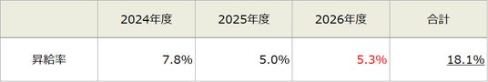 以上の観点から、2026年4月1日より全社員*を対象として管理職で月額5,000円、非管理職で月額12,000円の賃金改定を実施いたします。今回の賃金改定(定期昇給含む)による引き上げ幅は全体で平均5.3%となります。なお、直近3年間では合計18.1%の引き上げとなります。