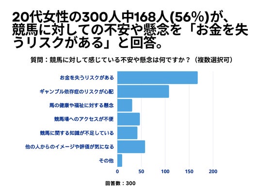 20代女性の300人を対象とした「競馬に対して感じている不安や懸念は何ですか?」というアンケートで168人(56%)が「お金を失うリスクがある」という結果になりました。