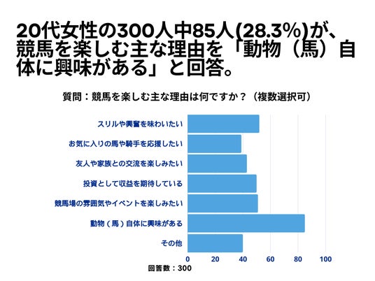 20代女性の300人を対象とした「競馬を楽しむ主な理由は何ですか?」というアンケートで85人(28.3%)が「動物(馬)自体に興味がある」という結果になりました。
