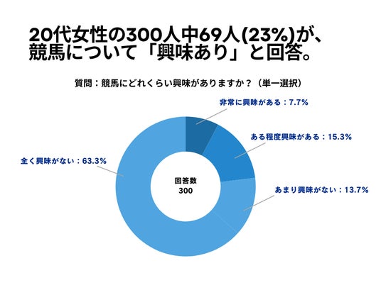 20代女性の300人を対象とした「競馬にどれくらい興味がありますか?」というアンケートで69人(23%)が「競馬について興味あり」という結果になりました。