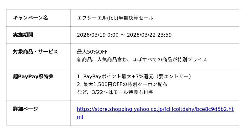 車・バイク用カスタムパーツ専門店エフシーエル(fcl.)を展開する株式会社WiNEEDS HOLDINGS(所在地:広島市南区、代表取締役社長:尾田 雅史)は、2026年3月21日(土)よりYahoo!ショッピングにて開催される「超PayPay祭」に合わせ、2026年3月19日(木)から最大50%OFFとなる半期決算セールを開始します。