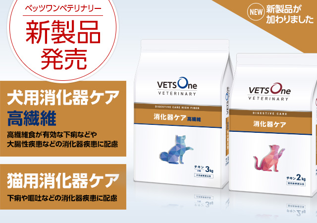 ペットゴー株式会社(本社:東京都中野区、代表取締役社長:黒澤弘、証券コード:7140)は、ペットヘルスケアブランド「ベッツワン(VETSOne)」から、消化器疾患(高繊維食が有効な下痢などや大腸性疾患)の犬のための食事療法食「犬用 消化器ケア 高繊維 チキン 小粒」、消化器疾患(下痢、嘔吐など)の猫のための食事療法食「猫用 消化器ケア チキン」を発売しました。