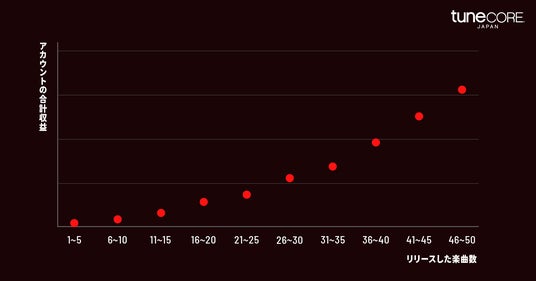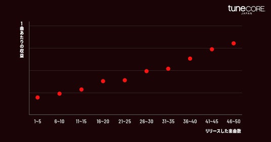 これまでTuneCore Japanでは累計100万曲以上が配信リリースされ、利用アーティストは累計500億円以上の収益を受け取っています。これらのデータをもとに利用アーティストが配信した累計楽曲数と累計収益の関係性をみると、多く楽曲をリリースしているアカウントほどアカウントの収益は多く、また1曲あたりの収益も増加する傾向が見られます。中にはバイラルヒットした楽曲も含まれますが、大局的には継続したリリースがリスナーやファンとのコミュニケーションを促進し、新譜のみならず、過去カタログ作品の再生にもつながることで、アーティストの収益が上昇していることがわかります。