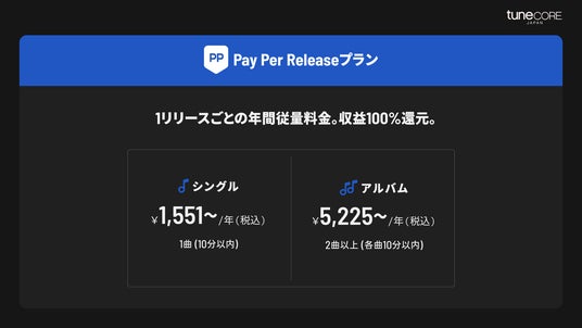 TuneCore Japanは、音楽アーティストやクリエイターといったサービス利用者が無制限に創造力を解き放てるように、そして充実した音楽活動を行うことができるよう、誰でも音楽配信ができるサービスを提供しています。今回、従来のシングル・アルバムごとの従量課金プラン「Pay Per Releaseプラン」に加えて、新たに年間固定料金で無制限にリリースができる「Unlimitedプラン」が加わります。選択肢が増えたことで、サービス利用者は自身の音楽活動環境に合わせて、いずれかの音楽配信プランを選択することが可能になります。