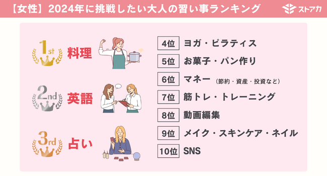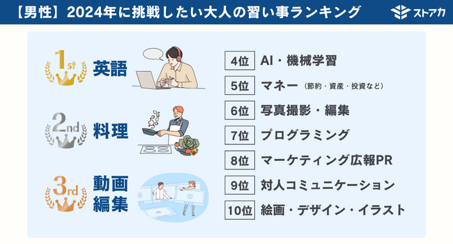 2024年、大人が挑戦したい習い事ランキングでは、男女で共通するトレンドとして「料理」や「英語」が1位・2位にランクインしました。