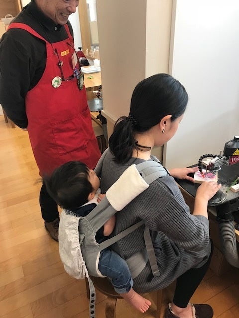 お子さんをおんぶしながら糸ノコに向かうお母さん。音も静かなのでグッスリお昼寝です。