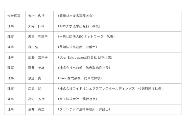 ITが人々の生活を変えていく様子は目覚ましく、日本が世界に誇る「食」の領域でも、新しいデリバリーの形が急速に広がりつつあります。自宅や職場における「美味しい食事」を担うプラットフォームとして、飲食店や配達者のみなさまと協力しながら、社会インフラの一つにまで磨き上げていく必要性を真摯に感じております。本協会の活動を通して、市場の健全な成長にむけた課題の解決に、協力して取り組んでまいります。