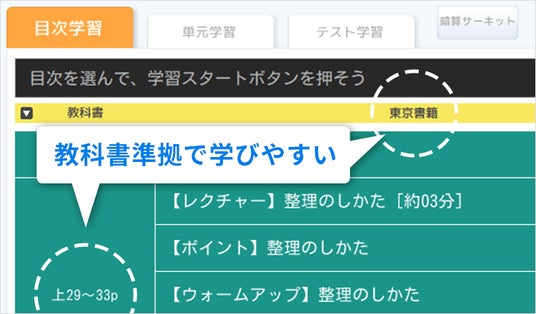 2020年度の教科書改訂に続き、2024年度の教科書改訂後も出版社のカバー率は100%となります。「天神」が各社の検定教科書に"準拠"することで、全国のユーザーは教科書の目次と全く同じ内容でページ数を確認しながら、スムーズに学習できます。
