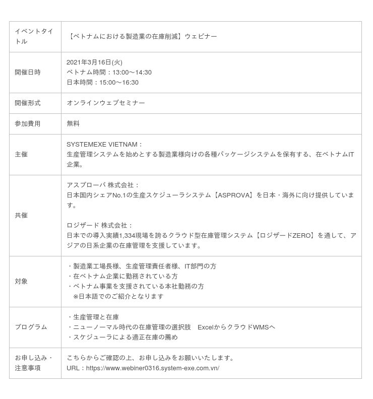 2021年3月16日(火)に開催されるSYSTEMEXE VIETNAM(以下システムエグゼベトナム)社主催「【ベトナムにおける製造業の在庫削減】ウェビナー」に、ロジザード株式会社(東京都中央区、代表取締役社長:金澤 茂則、以下ロジザード)企画営業部小林 秀徳が登壇いたします。