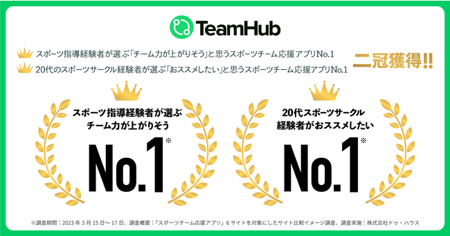 株式会社Link Sports(本社:東京都千代田区、代表取締役:小泉真也)の開発・運営するアプリ「TeamHub」が、スポーツチーム応援アプリに関する調査(以下、本調査)において、「 スポーツ指導経験者が選ぶ『チーム力が上がりそう』と思うアプリ」、「 20代のスポーツサークル経験者が選ぶ『おススメしたい』と思うアプリ」の二部門でNo.1を獲得しました。