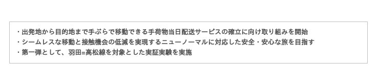 CBcloud株式会社(本社:東京都千代田区、代表取締役CEO:松本隆一、以下:「CBcloud」)、日本航空株式会社(本社:東京都品川区、代表取締役社長:赤坂祐二、以下:「JAL」)、ならびに三菱地所株式会社(本社:東京都千代田区、代表執行役執行役社長:吉田淳一、以下:「三菱地所」)は、ニューノーマルに対応した「より安全な旅」の実現を目指し、お客さまが出発地から滞在先のホテルなどの目的地まで安全・安心・快適にご移動できる新たな移動体験の創出に向け、手荷物当日配送サービスの実証実験を実施します。第一弾として、羽田=高松線で12月1日より実施いたします。