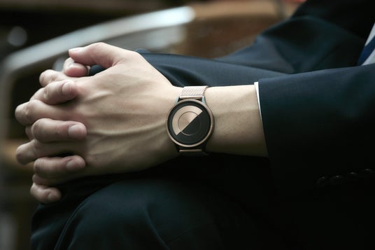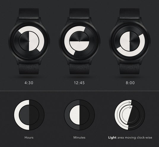 外側の半月が「時間」を、内側の半月が「分」を表し、光の先端が現在時刻を表示します。ユニセックス対応。