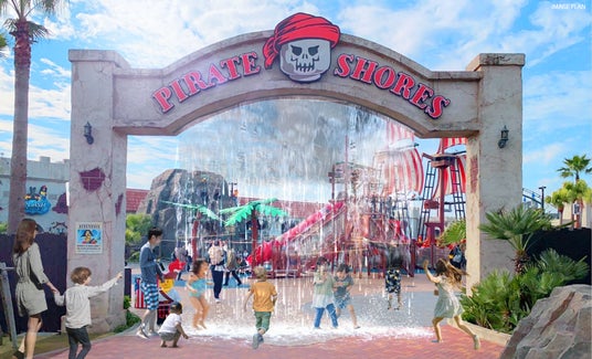高さ約4mから滝のように水が流れ落ちるエリアゲートをくぐり抜ければ、そこは四方八方から水が飛び交い空からも大量の水が降り注ぐびしょ濡れ必至のエリア、「パイレーツ・ショア」。エリア中に配置された全11基のウォーターキャノンからは、30秒毎に3.2~6リットル/基の水が降り注ぎ、海賊船に乗り込む「スプラッシュ・バトル」では、至近距離で浴びせられる水鉄砲でずぶ濡れに。さらに新設された5基のウォーター・ボムの発射ボタンを押せば水中から高さ約15mの水柱が勢いよく噴き出し、あたり一面を一瞬にして水びたしに!上から下から横から、縦横無尽に放たれる圧倒的な水量に驚き、ご家族で思い切り濡れて笑って、遊びつくす夏の一日をお過ごしください。