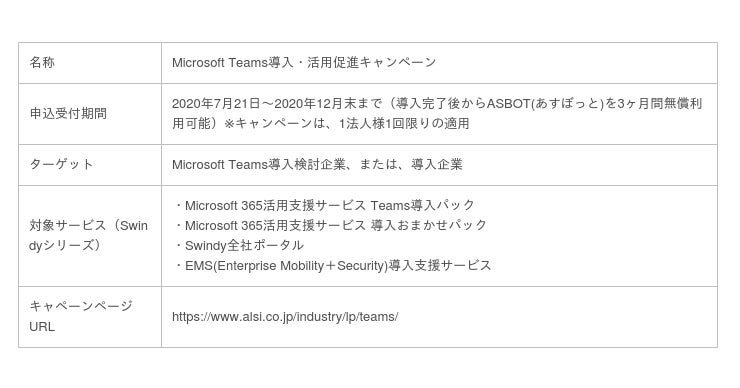アルプス システム インテグレーション株式会社(本社:東京都大田区、代表取締役社長:永倉 仁哉、以下ALSI〔アルシー〕)は、Microsoft Teams導入検討企業、または、導入企業向けに2020年7月21日より「Microsoft Teams導入・活用促進キャンペーン」を開始することを発表いたします。