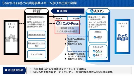 「あらゆる課題は、人で解決する。」をコーポレートステートメントとするアクシスコンサルティング株式会社(本社:東京都千代田区/代表取締役社長 COO:伊藤 文隆)は、スタートアップのエコシステムプラットフォームを提供する株式会社StartPass(本社:東京都新宿区、代表取締役 小原 聖誉、以下「StartPass」)に対する出資を実行したことをお知らせいたします。当社はこれまで、StartPassと共同事業「CxO-Pass」を推進し、事業成長や新たな価値創出に取り組んでまいりました。本出資により、両社のパートナーシップをさらに強化し、今後の共同事業における競争力の向上を目指します。