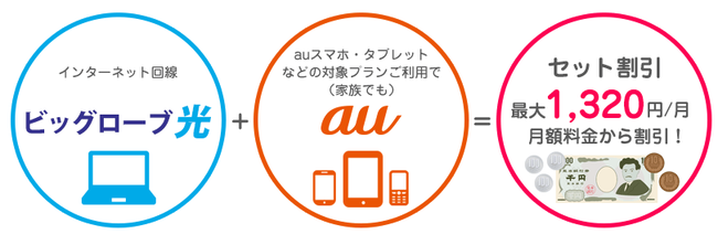 ◆ビッグローブ光+auスマホのご利用で、ビッグローブ光の料金が毎月最大1,320円割引