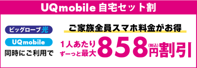 ◆ビッグローブ光+UQモバイルのご利用で、スマホ料金が毎月最大858円割引