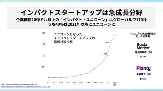 近年、インパクトスタートアップが世界的に盛り上がりをみせています。海外の調査レポートの定義に基づくと、企業価値10億ドル以上の「インパクト・ユニコーン」はグローバルで179社あり、そのうち40%は2021年以降にユニコーンになるなど各国で目覚ましい成長を遂げています。