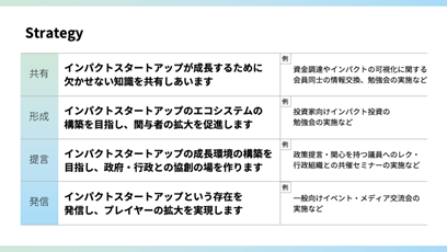 「提言」:インパクトスタートアップの成長環境の構築を目指し、政府・行政との協創の場を作ります。政策提言・関心を持つ議員への説明会、行政組織との共催セミナーの実施などを検討しています。