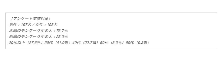 そこで株式会社ネクストレベル(本社所在地:神奈川県横浜市、代表取締役:田中大洋)が運営する『縁結び大学』(https://jsbs2012.jp/date/)では、テレワーク中の男女300名を対象に“Withコロナ時代”の新たな課題といえる「テレワーク中のモチベーションの上げ方」についてアンケート調査を行いました。