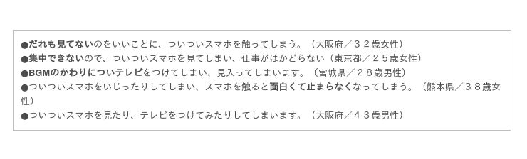 仕事中にテレビをつけようという人は少ないと思いますが、家族が自宅にいる場合はテレビがついている状態で仕事をするという状況も考えられます。見るつもりはなくても、「ついテレビに視線がいってしまう」ということはありそうです。