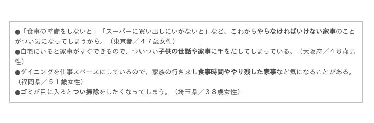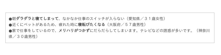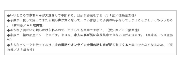 また小さい子どもがいる場合、協力を求めるのが難しいケースも多く見られました。「集中したいのにできない」ことでイライラしてしまい、それが仕事にも家庭にも悪影響にならないか心配なケースです。