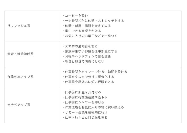 次に同じ300名に対し、モチベーションや集中力が低下した際に実践してみた対処法について尋ねました。挙がった項目は次のようなものです。