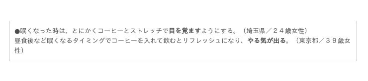 実践している人の回答を見てみると、「コーヒーを飲む」に関しては、眠くなってきたタイミングなどに飲んでいる人が多い傾向でした。気分がスッキリするという人が多く、効果があると感じている人は多いようです。