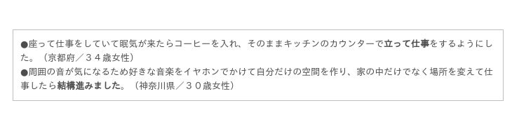 一方、「効果がなかった」と回答した割合が28.6%ともっとも多かったのは「仕事前や昼休みに短い仮眠をとる」、次が23.1%で「仕事前に有酸素運動や筋トレをする」でした。どの対策も効果があるか否かには個人差があるようですが、特にこの2つの対策に関しては、他よりも個人差が大きいと言えそうです。