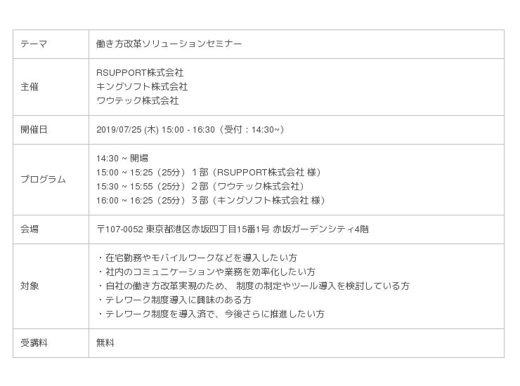 2019年7月25日(木)、ビジネスチャット・社内SNS「WowTalk(ワウトーク)」を提供するワウテック株式会社(東京都中央区、代表取締役社長 瀬沼悠、以下「ワウテック」)は、リモートコントロールシステム「RemoteCall」「RemoteView」などを手がけるRSUPPORT株式会社(東京都港区、代表取締役 ソ・ヒョンス、 以下「RSUPPORT」)、総合オフィスソフト「WPS Office」などを手がけるキングソフト株式会社(東京都港区、代表取締役 馮達、以下「キングソフト」 )の3社で働き方改革の推進をテーマとした共催セミナーを開催いたします。