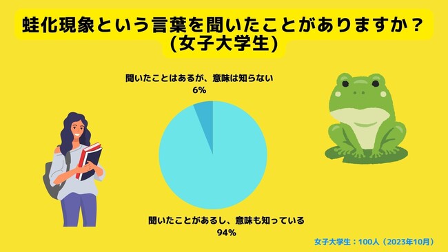 ■女子大学生の蛙化現象の認知率は100%、男子大学生の認知率は94%。