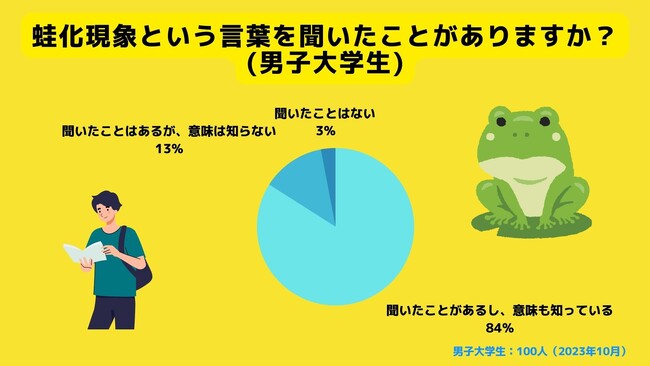 聞いたことがあり、意味も知っていると回答した女子大学生は94%、男子大学生は84%と蛙化現象というワードの意味の普及率に10%もの差があることが判明しました。普及率に10%もの差がる理由は女子の方が恋バナを沢山することが要因と考えられます。