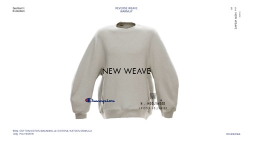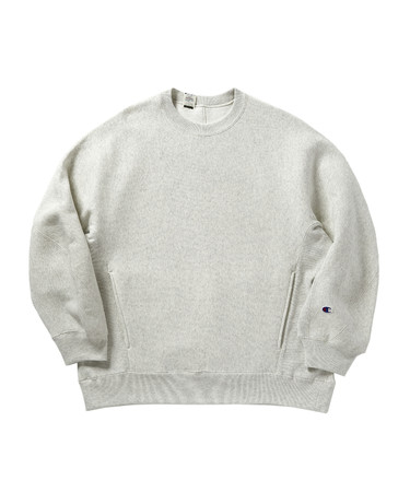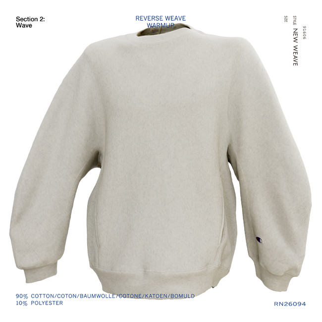 N.HOOLYWOOD とのコラボレーションによる、Champion を代表する製法の「REVERSE WEAVE(R)」を実験的に再構築し、「NEW WEAVE」と名付けたカプセルコレクション。着込むほどに独特の風合いや味わいが出る11.5oz(11.5オンス)の裏起毛素材を身体に沿った立体裁断で組み上げ、前身頃からスリーブの上部、後身頃にかけて一枚の生地で製作したクルーネックスウェットシャツです。ゆったりとしたワイドシルエットと、内側に入り込むような丸みを持たせたフォルムのスリーブが特長。両脇には「EXPANSION GUSSET(エクスパンションガゼット)」、カンガルーポケットの代わりにシームポケットを付けました。コレクション名の「NEW WEAVE」と両ブランドのロゴを入れた、コラボレーションを象徴するスペシャルな襟ネームが付きます。