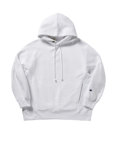 N.HOOLYWOOD とのコラボレーションによる、Champion を代表する製法の「REVERSE WEAVE(R)」を実験的に再構築し、「NEW WEAVE」と名付けたカプセルコレクション。着込むほどに独特の風合いや味わいが出る11.5oz(11.5オンス)の裏起毛素材を身体に沿った立体裁断で組み上げ、前身頃からスリーブの上部、後身頃にかけて一枚の生地で製作したフーデッドスウェットシャツです。ゆったりとしたワイドシルエットと、内側に入り込むような丸みを持たせたフォルムのスリーブが特長。両脇には「EXPANSION GUSSET(エクスパンションガゼット)」、カンガルーポケットの代わりにシームポケットを付けました。コレクション名の「NEW WEAVE」と両ブランドのロゴを入れた、コラボレーションを象徴するスペシャルな襟ネームが付きます。