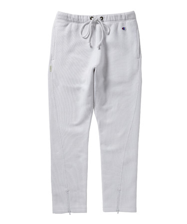 N.HOOLYWOOD とのコラボレーションによる、Champion を代表する製法の「REVERSE WEAVE(R)」を実験的に再構築し、「NEW WEAVE」と名付けたカプセルコレクション。着込むほどに独特の風合いや味わいが出る11.5oz(11.5オンス)の裏起毛素材を身体に沿った立体裁断で組み上げたスウェットパンツです。すっきりとしたスリムテーパードシルエットで、サイドシームを裾のファスナー部分にかけてねじるように前面センターへ切れ込ませたデザインがポイント。股下は動きやすく可動域を広げるガゼットリブ仕様です。コレクション名の「NEW WEAVE」と両ブランドのロゴを入れた、コラボレーションを象徴するスペシャルなネームが付きます。