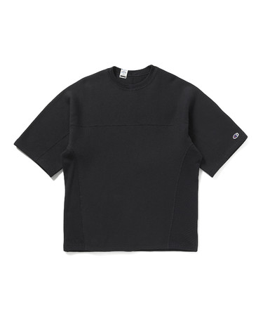 N.HOOLYWOOD とのコラボレーションによる、Champion を代表する製法の「REVERSE WEAVE(R)」を実験的に再構築し、「NEW WEAVE」と名付けたカプセルコレクション。着込むほどに独特の風合いや味わいが出る11.5oz(11.5オンス)の裏起毛素材を身体に沿った立体裁断で組み上げ、前身頃からスリーブの上部、後身頃にかけて一枚の生地で製作したショートスリーブスウェットシャツです。